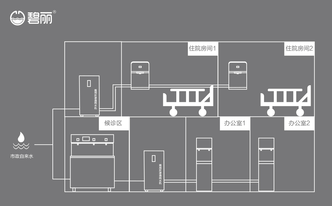 碧麗商用反滲透純水機將自來水集中處理后,把優(yōu)質的純凈水通過專用的供水管道輸送到各飲水點;